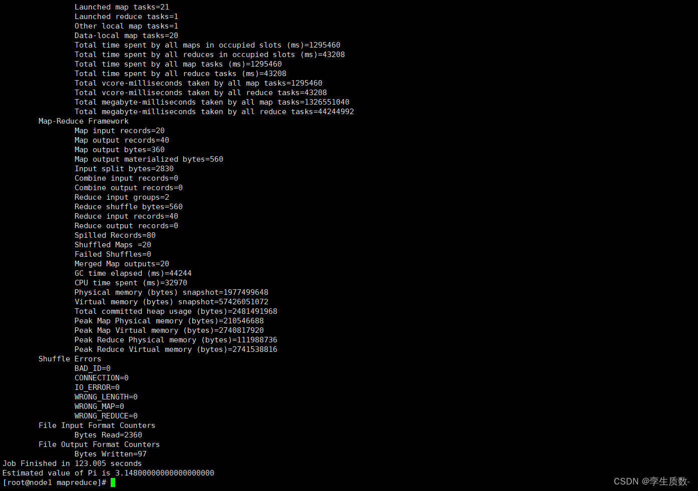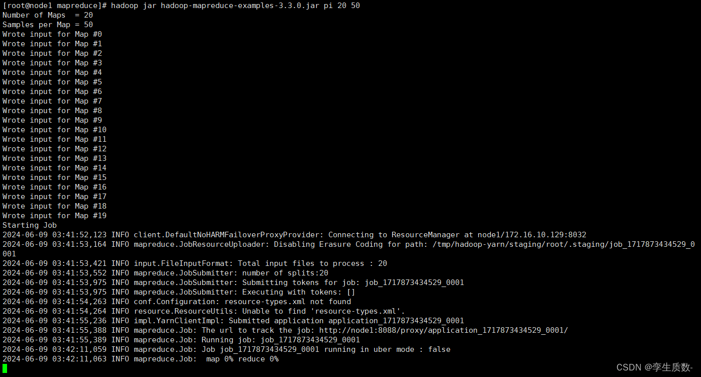 示例程序 jar:hadoop-mapreduce-examples-3.3.0.jar计算圆周率:hadoop jar hadoop-mapreduce-examples-3.3.0.jar pi 20 50![]()