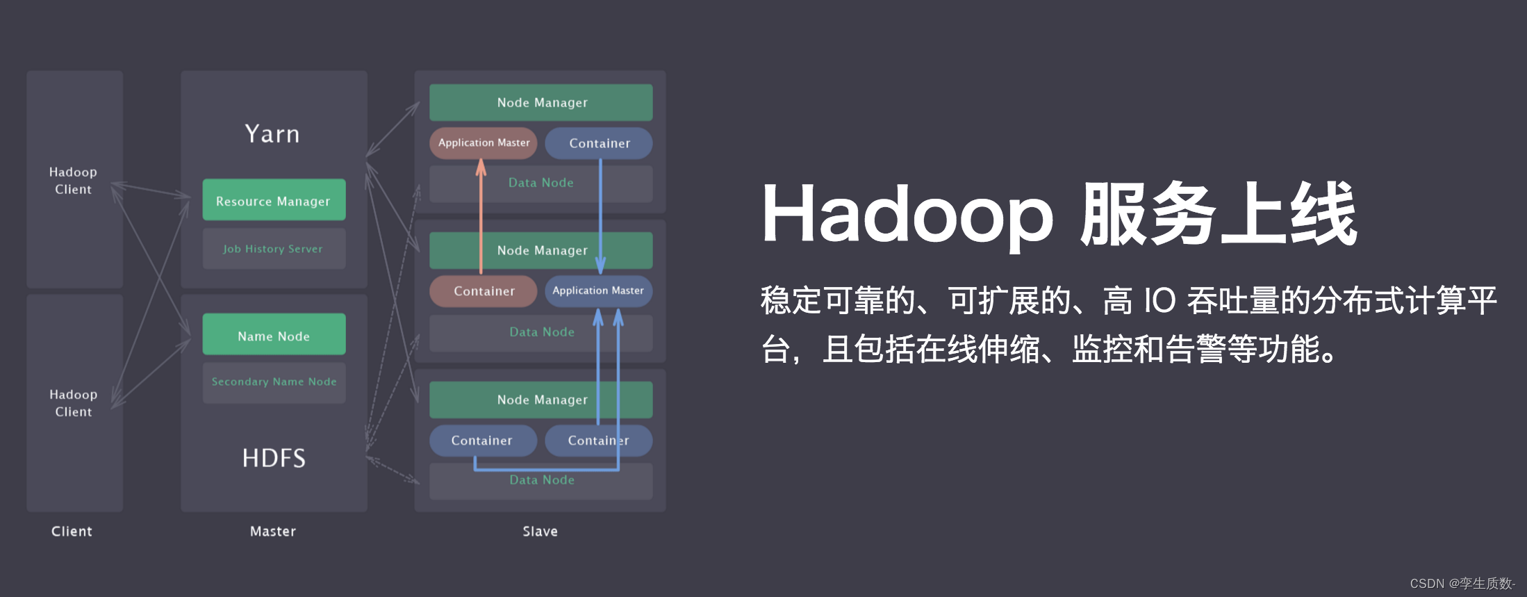 - 可扩展性:设计上支持大规模集群,容易横向扩展以处理更多数据和运行更多应用程序。