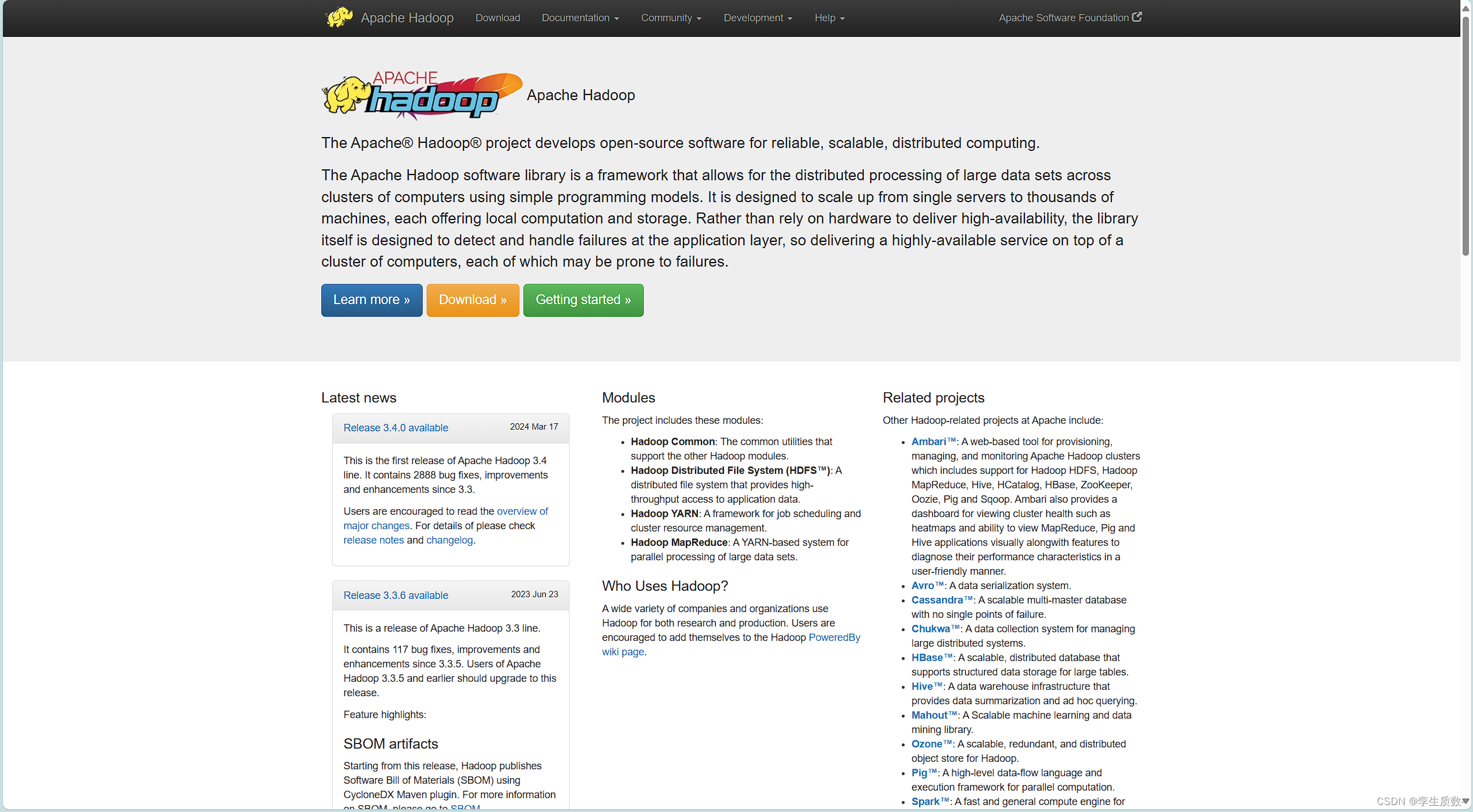 Spark: 虽然不是Hadoop直接的组成部分,但常与Hadoop生态系统集成使用,提供了一个更快、更通用的数据处理框架,支持批处理、交互式查询、流处理和机器学习等多种计算模型。