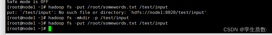 hdfs://node1:8020/test/input'”时,意味着你在尝试使用Hadoop的hadoop fs -put