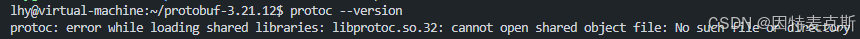 原因:表明系统在尝试运行 protoc 时,无法找到 libprotoc.so.32 这个共享库文件。这个问题通常发生在安装或配置过程中,缺少了必要的库文件或库文件没有正确链接。