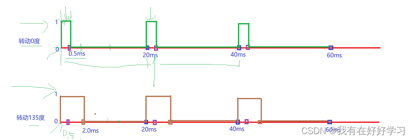定义一个角度标记,因为一次周期500微秒,角度1就表示0度,4就表示135度