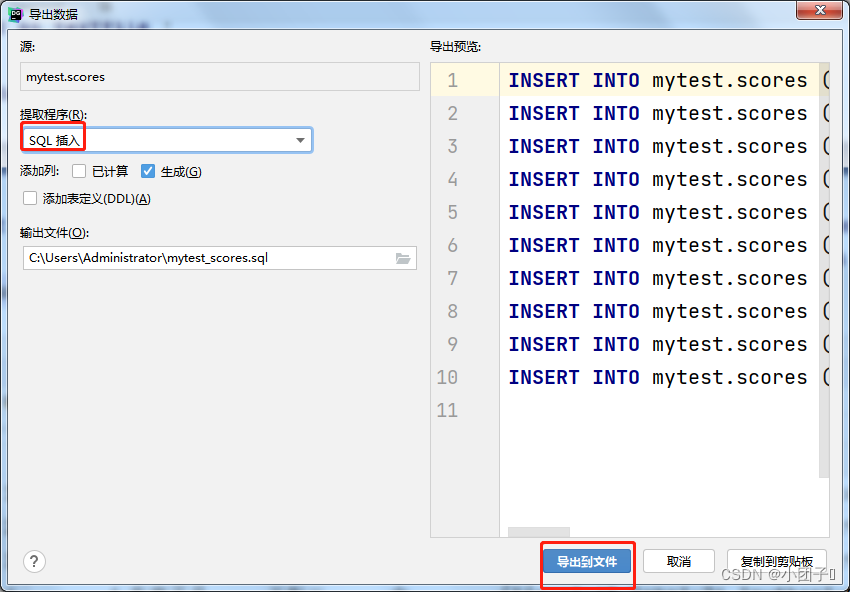 2.选择SQL插入,导出到文件后打开导出的那个文件,把里面的insert插入语句复制到oracle控制台,创建新表,然后执行insert语句,注意,该改的要改