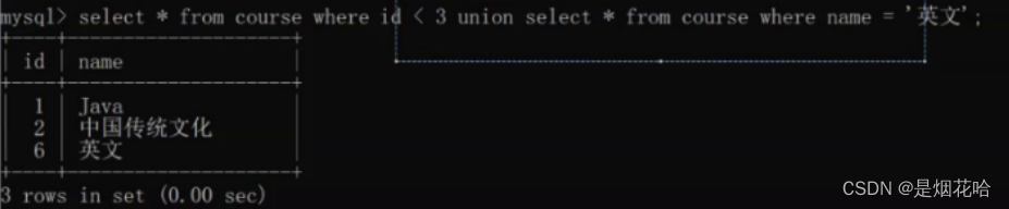 union:对两个查询结果进行并集操作,自动进行去重,不包括重复行,即去掉重复结果后再显示