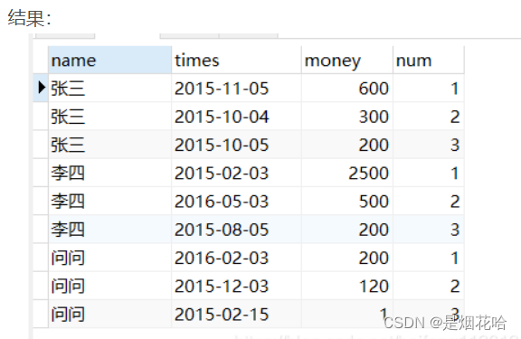 Select name,times ,money,ROW_NUMBER() over(PARTITION by name ORDER BY money desc) num
