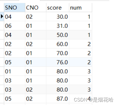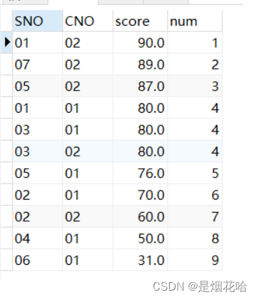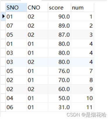 特点: rank()函数也是返回每条记录的排名序号,但当值相同时,序号也将相同,同时跳跃排序(比如:第一名、第一名、第三名)