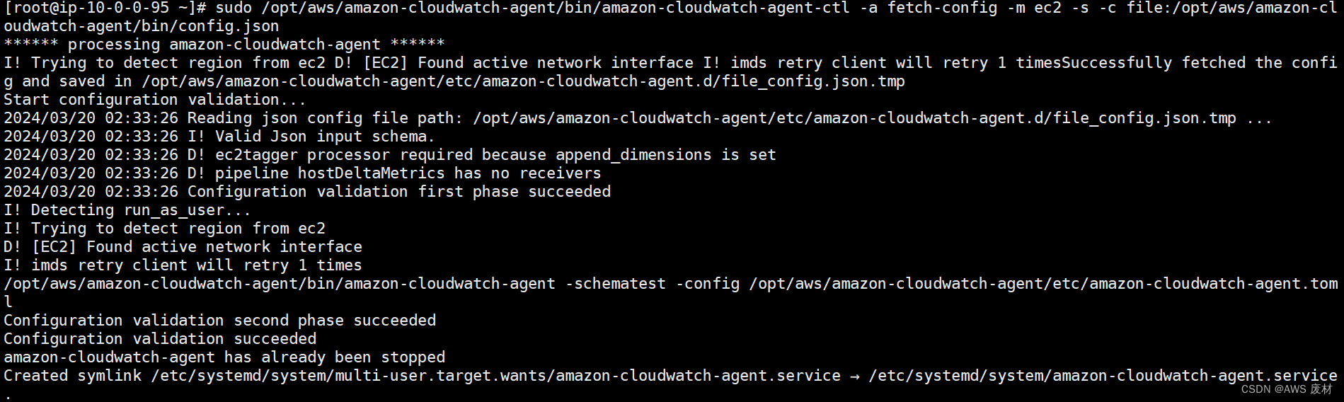 命令中-a fetch-config会把代理加载最新版本的CloudWatch代理配置文件,-s启动代理