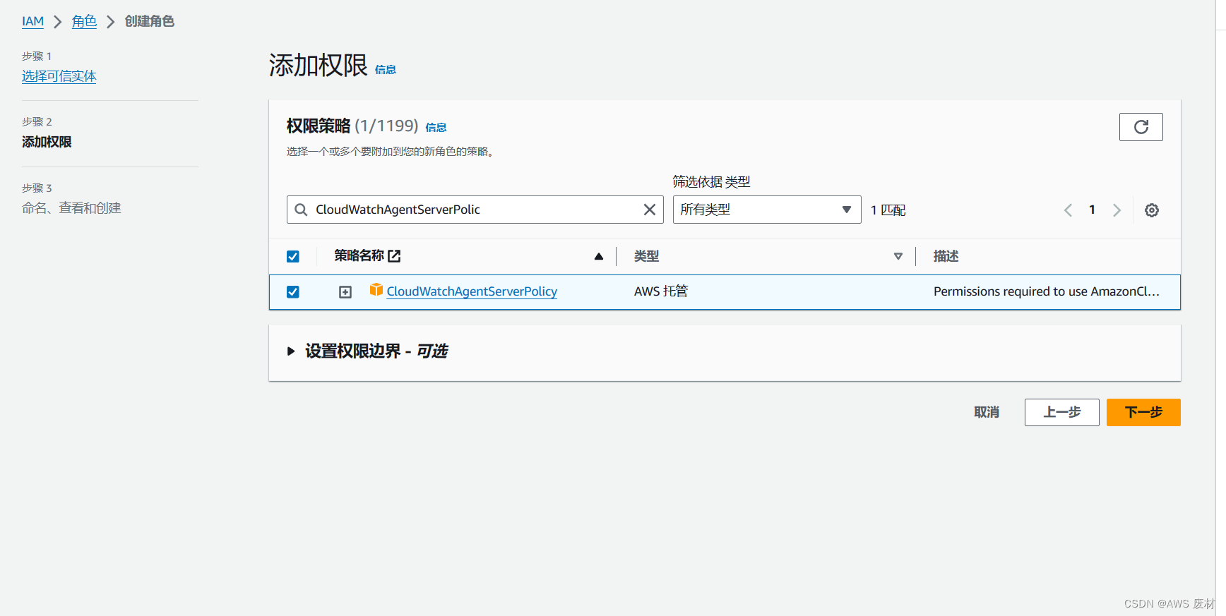 CloudWatch 代理在 Amazon Linux 2 中以软件包的形式提供。如果您使用的是此操作系统,则可以安装 package 通过输入以下命令。您还必须 确保附加到实例的 IAM 角色具有 附加的 CloudWatchAgentServerPolicyCloudWatch 代理在 Amazon Linux 2 中以软件包的形式提供。如果您使用的是此操作系统,则可以安装 package 通过输入以下命令。您还必须 确保附加到实例的 IAM 角色具有 附加的 CloudWatchAgentServerPolicy
