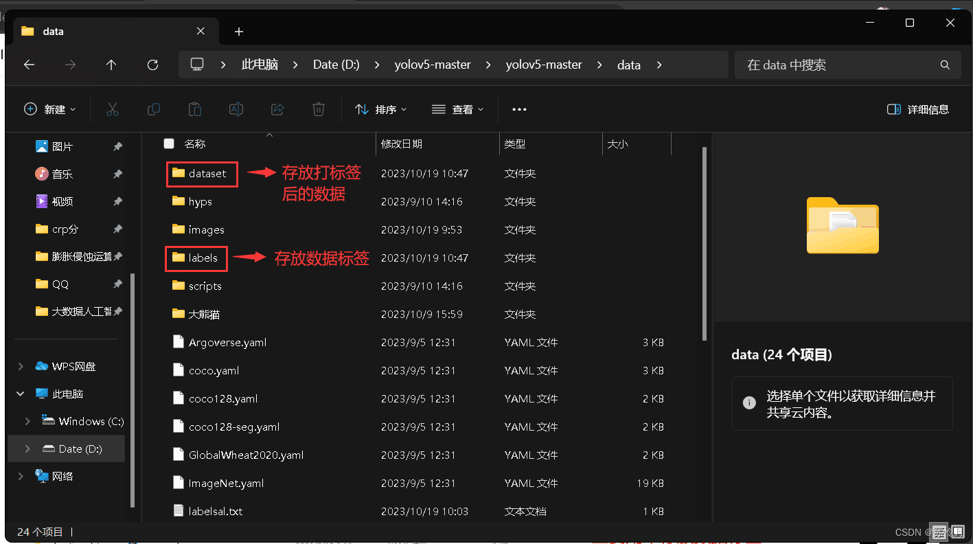 在工程中的data文件夹下新建两个文件夹,分别为dataset、labels。其中,datasets主要用来存放打好标签后的数据集,labels主要用来存放数据标签。具体如下图所示: