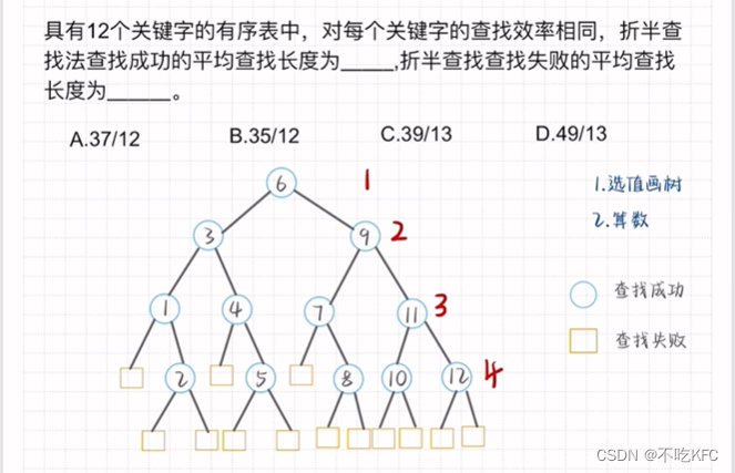 查找的次数=每一层的层数 x 每一层的结点个数,上图即是1x1 + 2x2 + 3x4 + 4x5 = 37,则查找成功的平均查找长度为37/12,注意:当计算查找失败的平均长度时,层数需要依次减1,即原先第四层变为第三层,然后进行查找失败的次数的计算,即是3x3 + 4x10 = 49。步骤2.然后左边剩余的1-5当中继续重复步骤一得到6的左儿子。(以上算式中“x”前面的为层数,后面为该层的结点数),则对应的查找失败的平均查找长度为49/13。步骤1.先取中间结点作为树的根,通过计算。