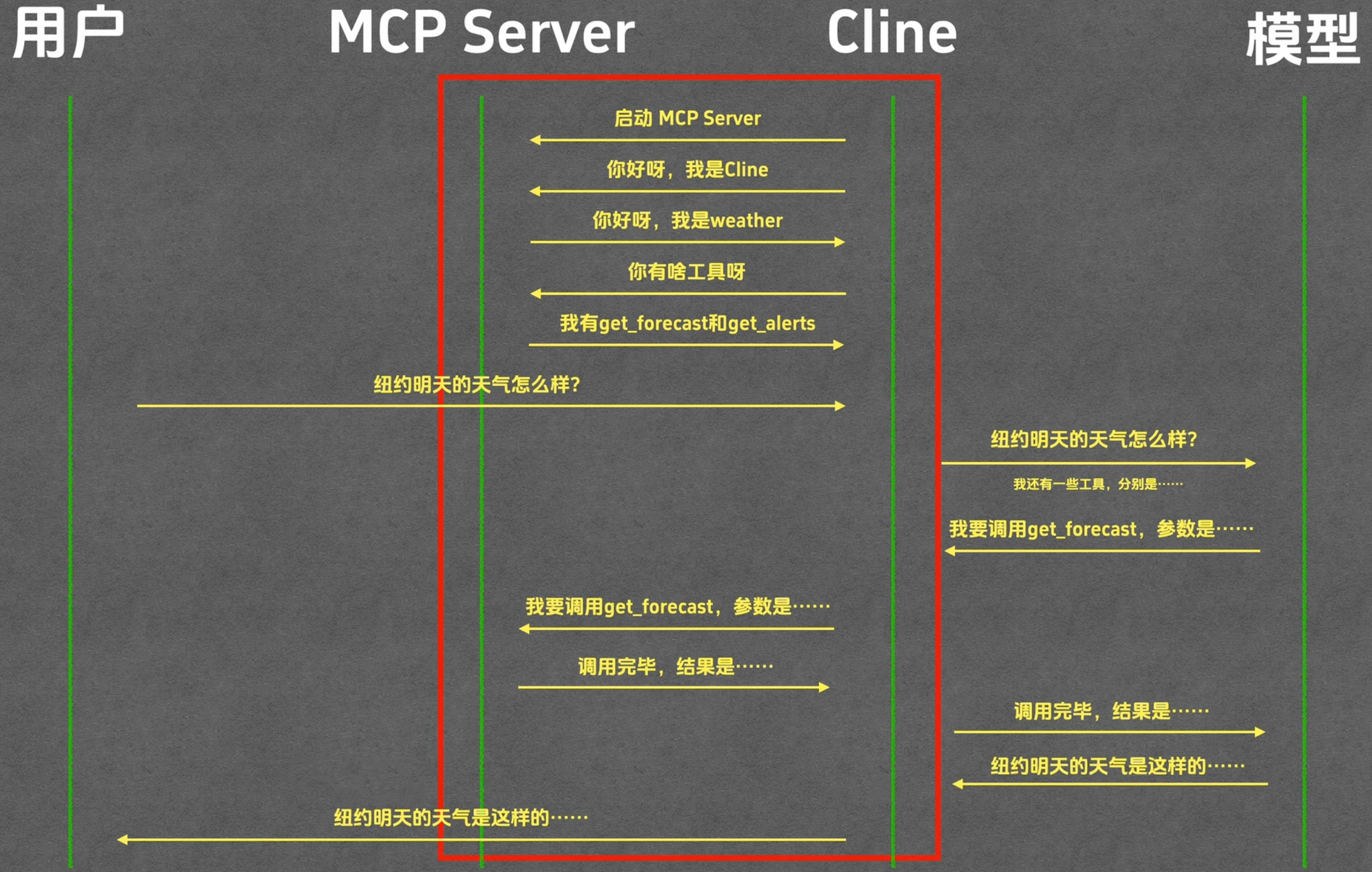 MCP协议规定的内容仅限于红色圈出来的环节的交互,即函数的注册与使用