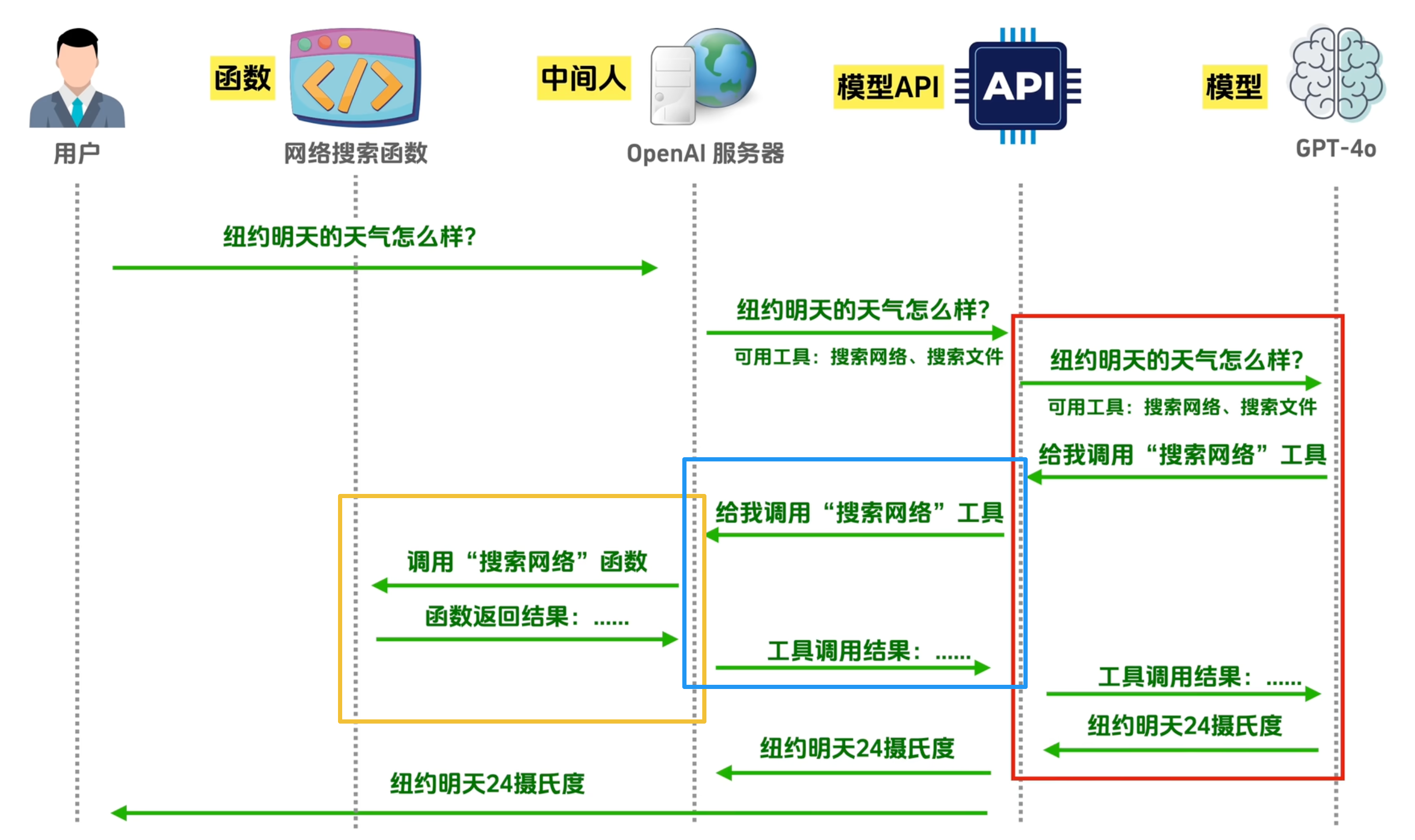 - 定义:模型主动调用预定义的外部函数来获取信息或执行操作