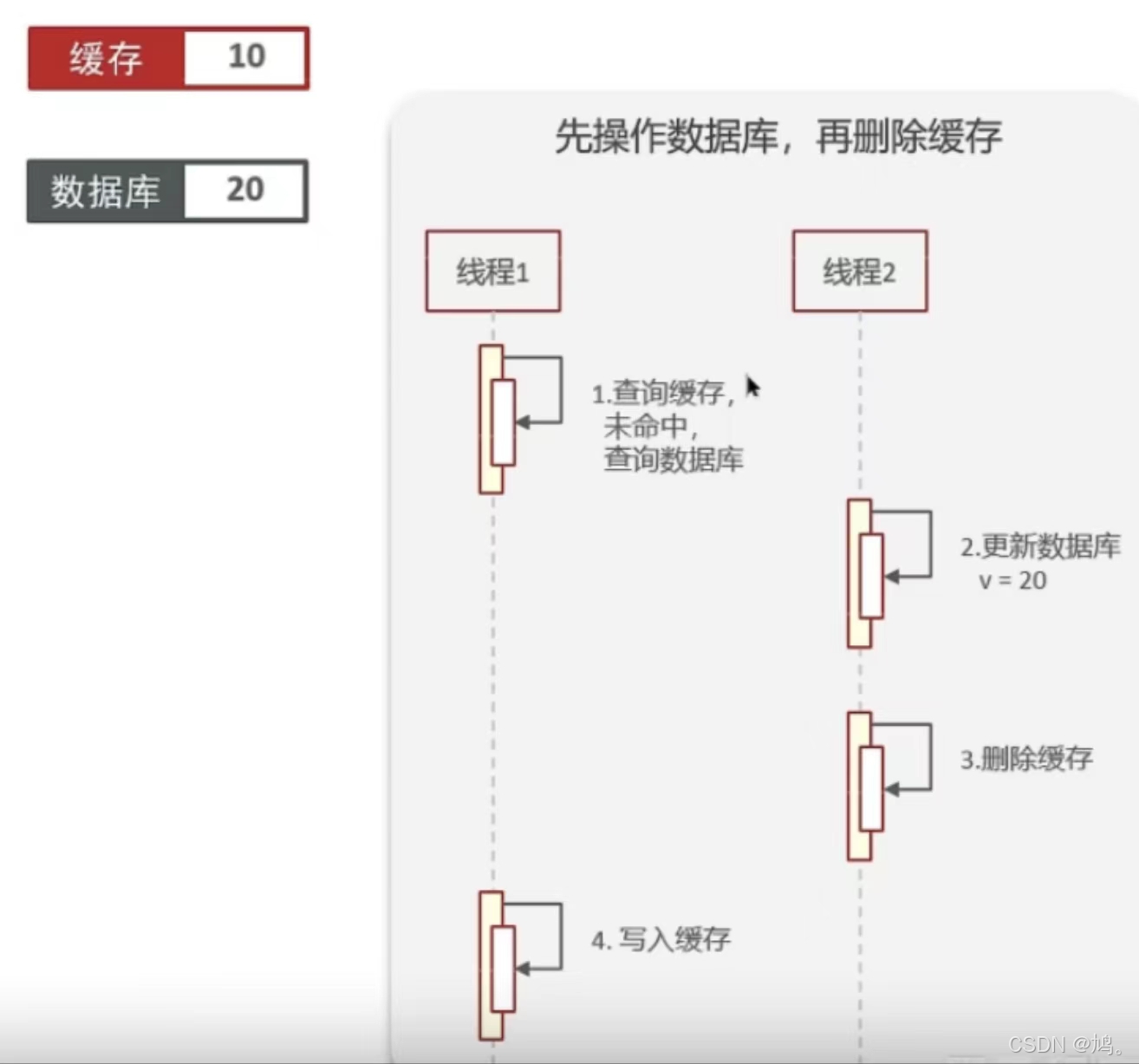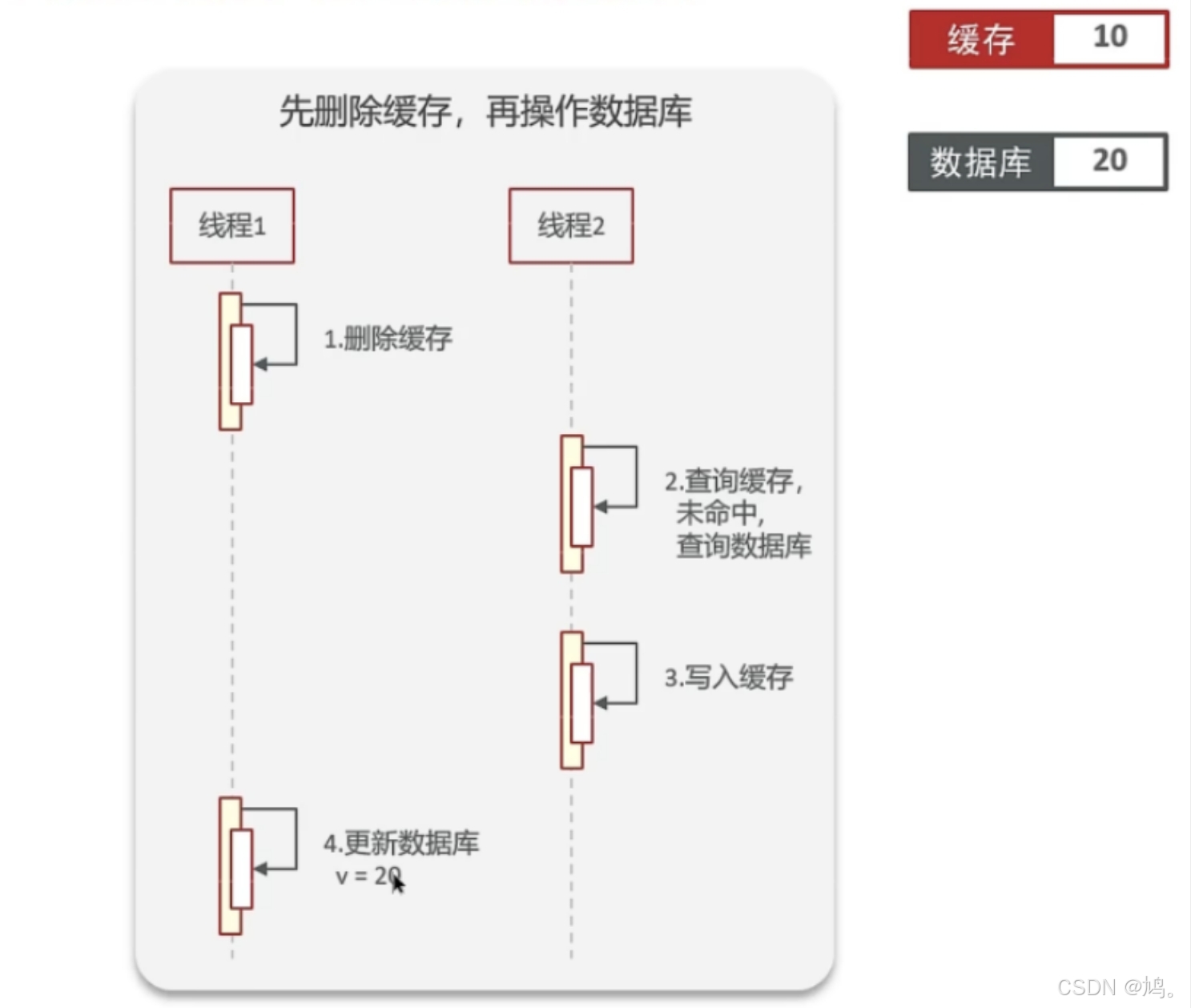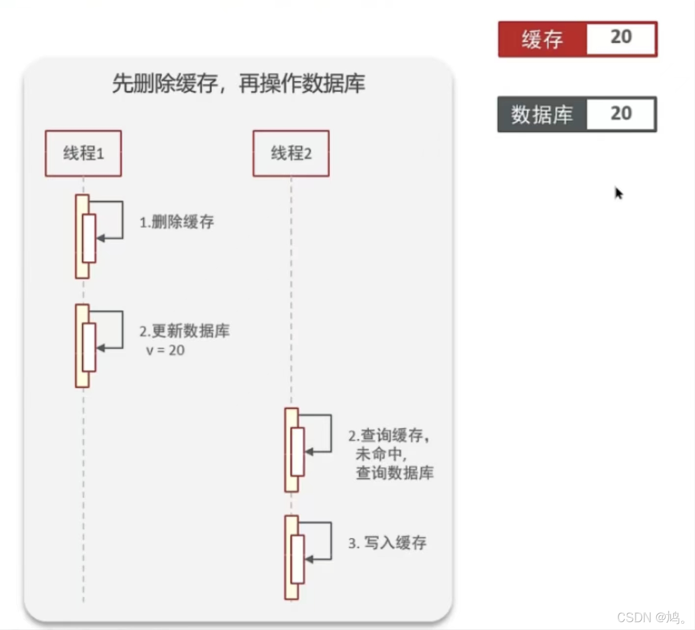 在这张图里,线程一先操作,查询缓存未命中,开始查询数据v=10尝试写入缓存。此时,线程二加入,将数据库数据更新为v=20,再删除缓存(缓存中没有数据的情况下删不删缓存都无所谓的)。接下来线程一写入缓存,写入开始的v=10。