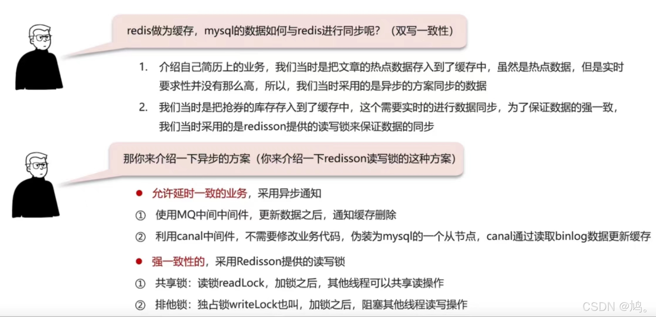 双写一致性:当修改了数据库的数据也要同时更新缓存的数据,数据库的数据和缓存的数据要保持一致