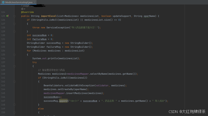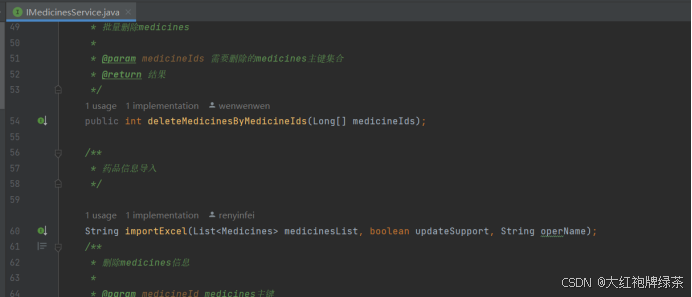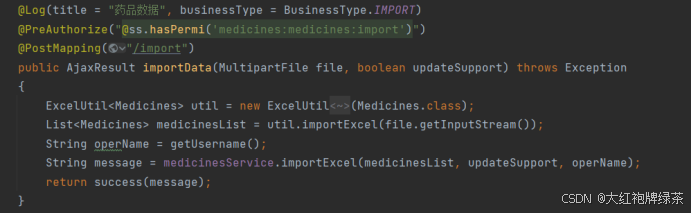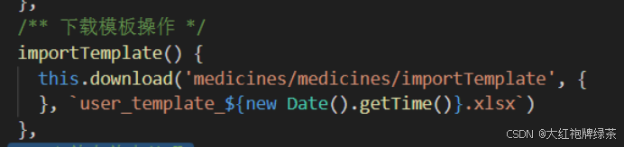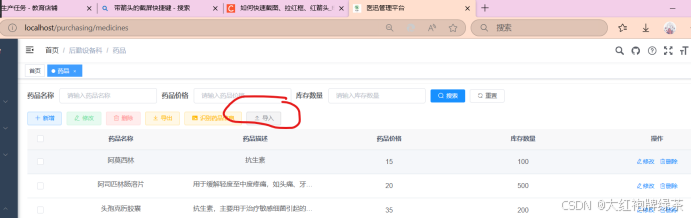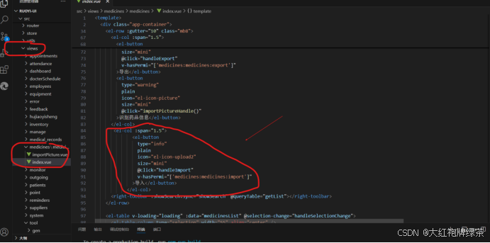 我的导入功能是在药品页面呈现的,所以找到前端页面的views分类下面所要找的页面下面的index.vue页面中进行代码添加。按钮的整体框架没有改变,需要改变一下点击实现的事件,也就是@click=”handleImport”这段代码,这句代码是用来确实点击的事件,而下面这句代码是用来确保只有‘medicines:medicines:import’才能实现这个导入按钮的实现。