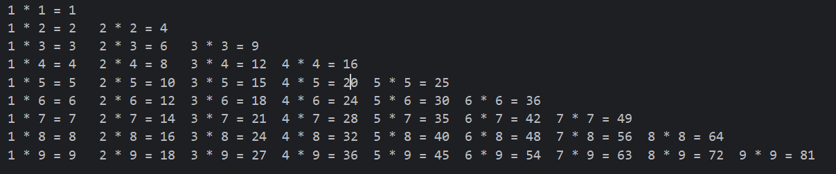 - 最终,运行这段代码将会打印出整齐的九九乘法表。