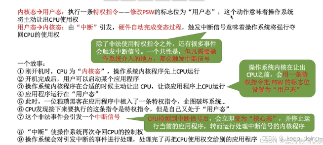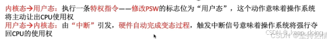 - 中断会使CPU由用户态变为核心态,使操作系统程序夺回CPU的控制权