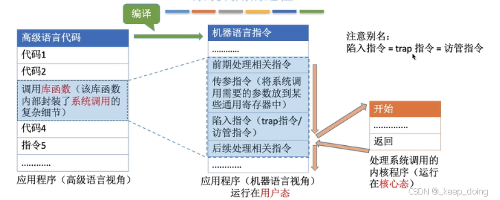 ③ 系统调用实现例程运行在系统态(核心态)而一般函数运行在用户态。
