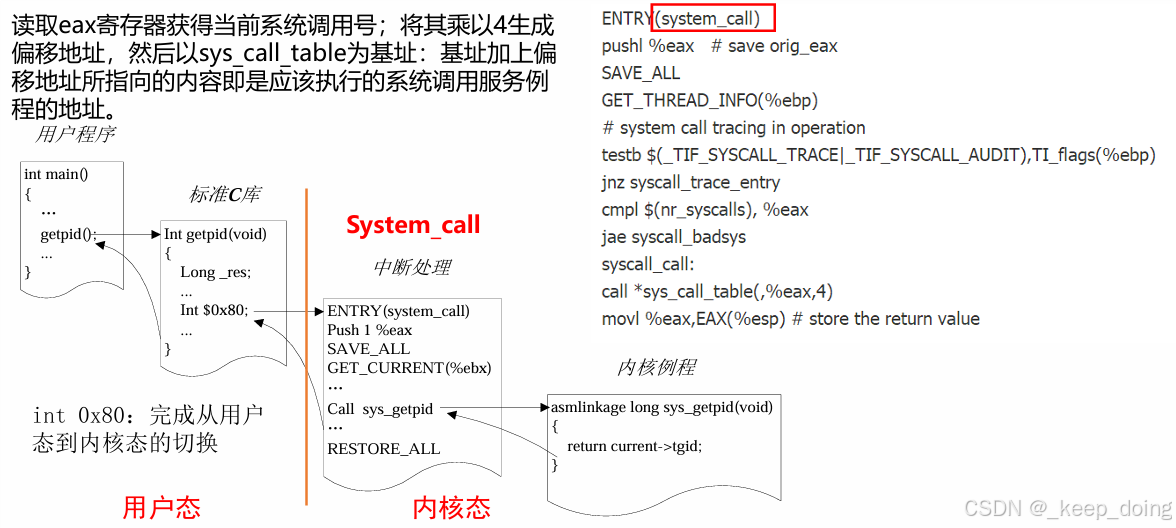 - 发出系统调用请求是在用户态,而对系统调用的相应处理在核心态下进行