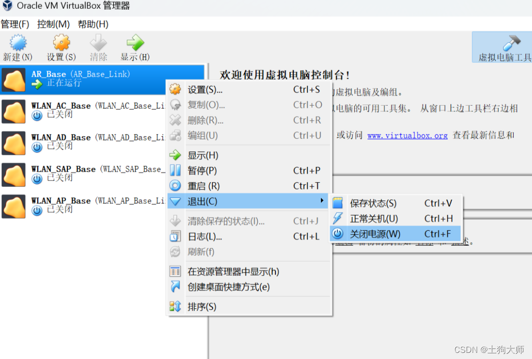 8、 执行命令后重启电脑,再次打开VirtualBox,再次启动AR_Base,启动成功后选中AR_Base单击右键,选择退出,再选择关闭电源,进入ensp放入路由器,尝试启动,若AR_Base启动无报错,则此时路由器能正常启动。