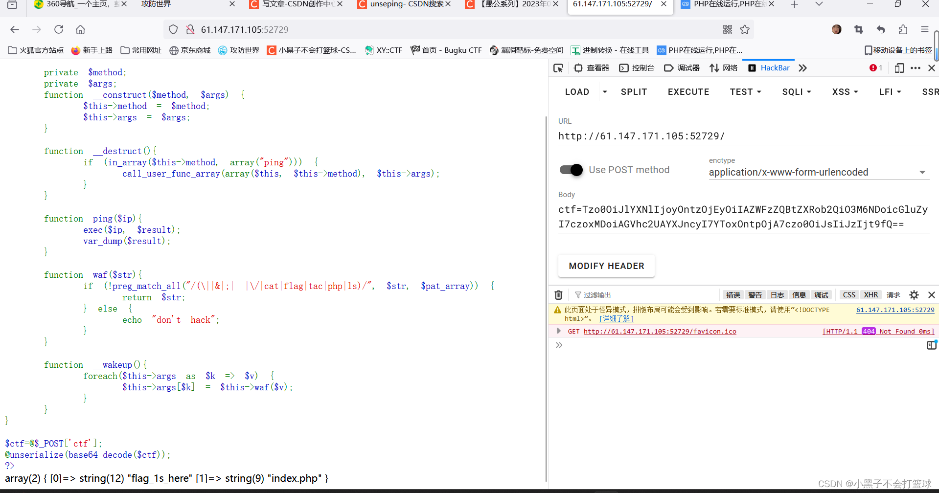 1.首先看题目可以知道是用POST传入参数从而达到系统查找,外边这个参数还进行了base64解码和反序列化编码,这又给我们上了一波难度。不过这算是简单的,我们先看函数。