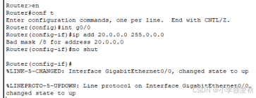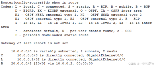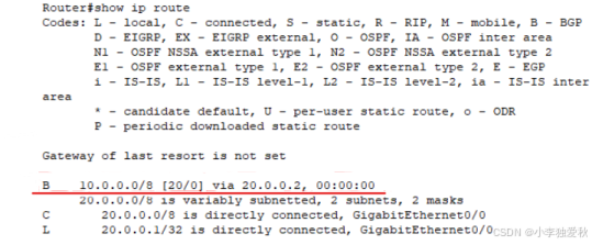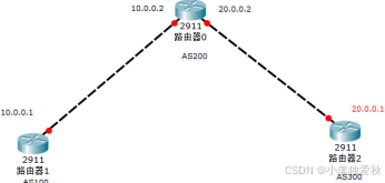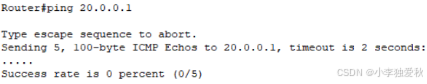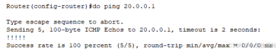 (4)第四步:验证左边路由器和右边路由器的通信,在路由器之间的ping的含义是,发送端会发送五次100比特长的ICMP报文给目的主机,如果超时两秒就会在下面显示点,成功显示感叹号,后面还会显示成功数量,可以看到第一次失败,这是因为左边路由器的路由表中没有右边路由器,虽然配置了BGP协议,但是并没有让它做什么事情,左边路由器是无法得知右边的网段,所以就需要将网段通告出去,再查看路由表就可以看到多了一条记录,B表示就是BGP协议,再次ping就可以ping通了,也就说明可以通信了,如图8~13所示。