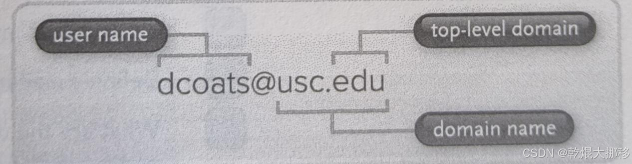 Addresses:电子邮件消息通常显示电子邮件的预期收件人、要接收电子邮件副本的任何人以及电子邮件发件人的地址,电子邮件地址有两份基本部分:第一部分是用户名,第二部分是域名,其中包括顶级域名。在图示邮件中,dcoats是收件人用户名,为收件人提供电子邮件服务的服务器为usc.edu,顶级域名表示提供者是教育机构。