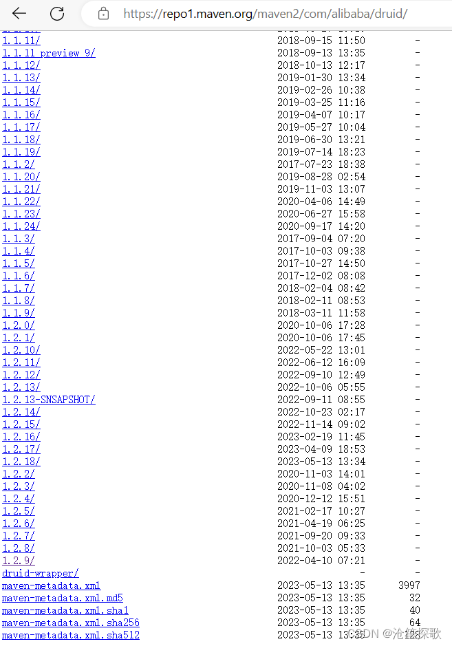 数据库连接池Druid的下载和配置、使用、报错解决方法 再在src目录下创建一个druid.properties文件,druid是文件名,properties是类型名,可以直接创建一个file文件,在创建时加上后缀.properties即可。下载后打开IDEA,在你要使用Druid的模块下右键,在new一个Driectory,我这里命名为lib,将你下载的jar包复制粘贴到lib文件下。进入后拉到最下面(因为我的数据库是8.0.33,所以我下载的是最新版的jar包即1.2.9/),点击1.2.9/如图所示,可能是数据库名输入错误,即自己的数据库名字输错。
