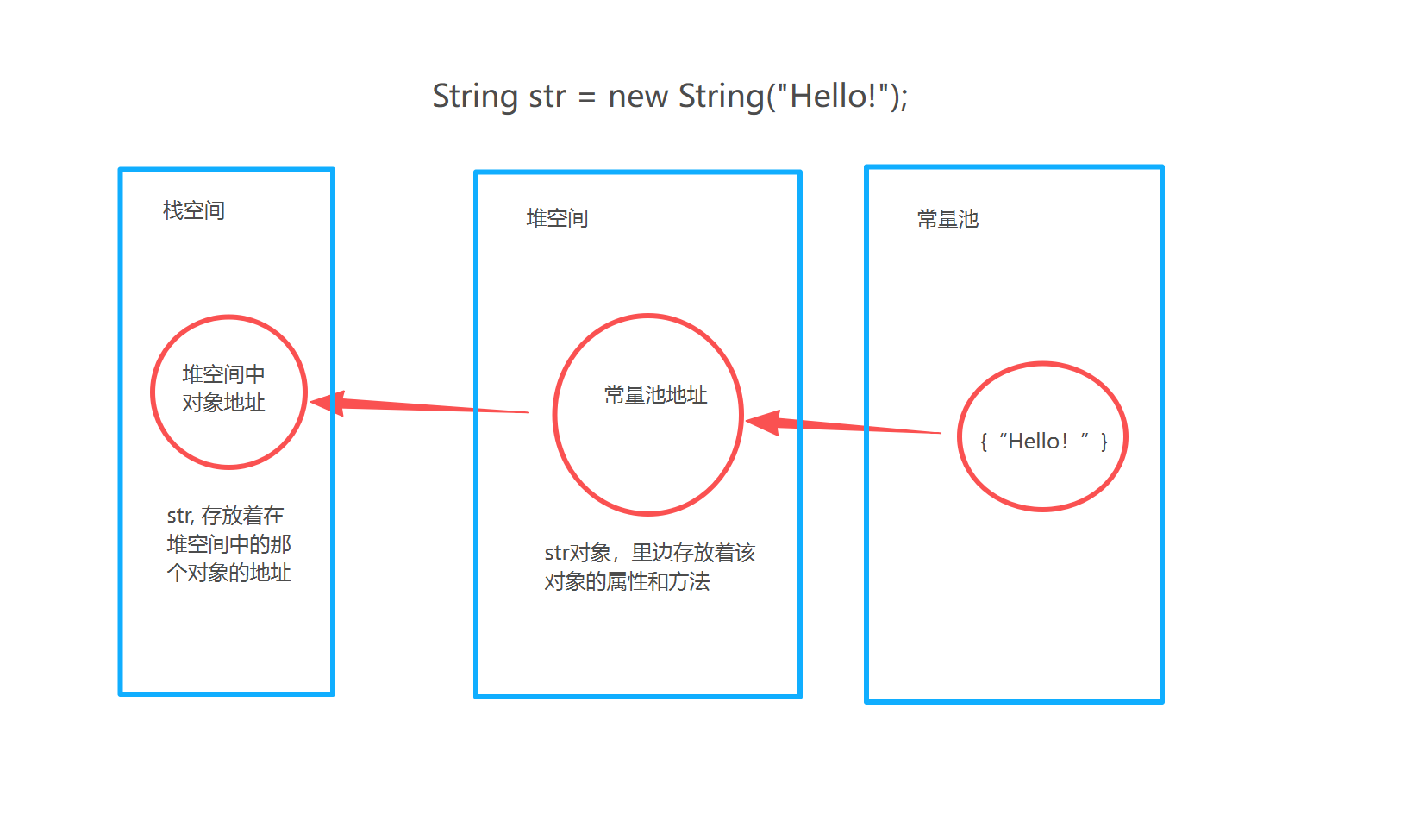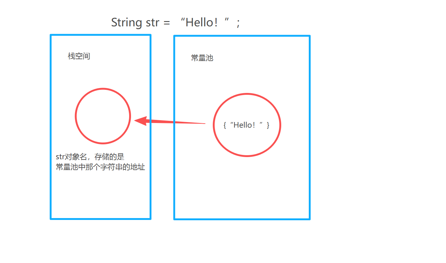 创建String对象时,首先会在字符串常量池中开辟空间存储字符串值,然后将该字符串地址赋给堆内存中的对象。栈内存中的变量名则保存着堆内存对象的地址。图示说明如下: