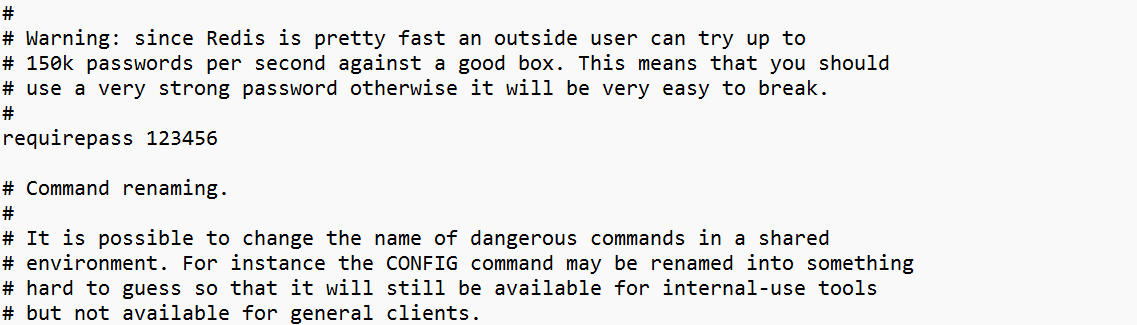 打开redis.windows.conf,找到requirepass,去掉注释,在后面加上密码(默认没有密码),注意不要有多余空格,否则会错误