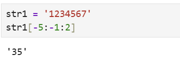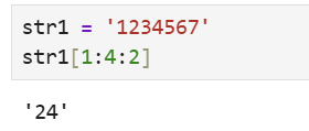 str1[1:4:2] # 那么这个字符串的起始位置为2,终止位置为5,片段长度为2,那么最后代表了2 4