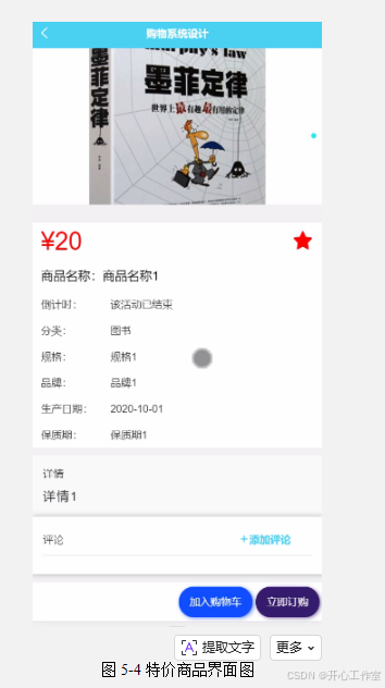 用户进入特价商品页面可以填写商品名称、倒计时、分类、图片、规格、品牌、生产日期、保质期、价格等信息,进行加入购物车、立即购买操作,如图5-4所示。