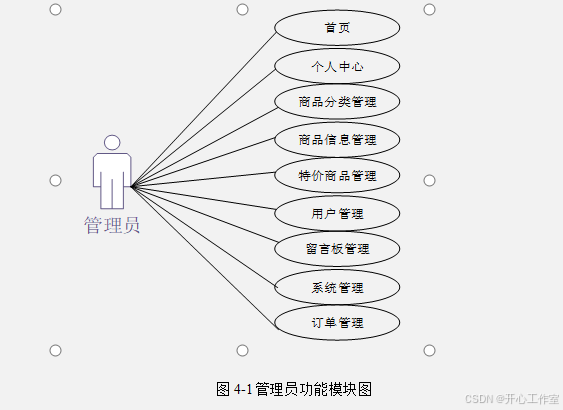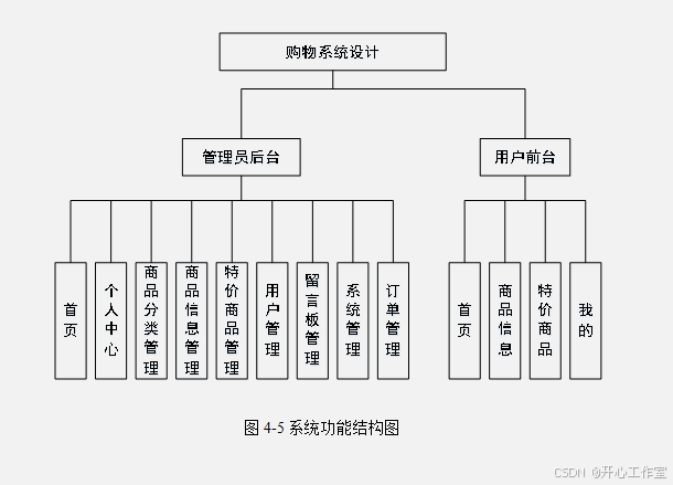 (3)确定好系统使用的技术,进行在线确认系统所划分的用户角色,并且根据用户角色划分确定所要设计的功能模块,对于购物系统设计系统的设计主要划分别为管理员和用户角色,并所使用的功能模块也相应不同,但是系统的数据库实现的内容是交互的,用户可以随时根据自己的需求进行商品信息,对于系统工作人员可以根据自己的分管内容进行在线信息的处理及操作,管理员获取到所有用户的详细数据信息,并根据需求进行第一时间处理解决。