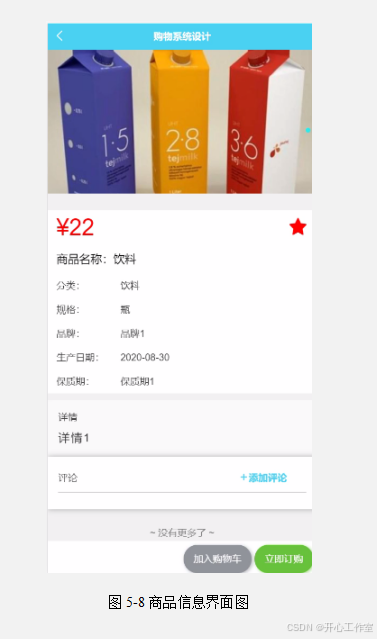 用户进入商品信息页面可以填写商品名称、分类、图片、规格、品牌、生产日期、保质期、价格等信息,进行加入购物车、立即购买操作,如图5-8-所示。