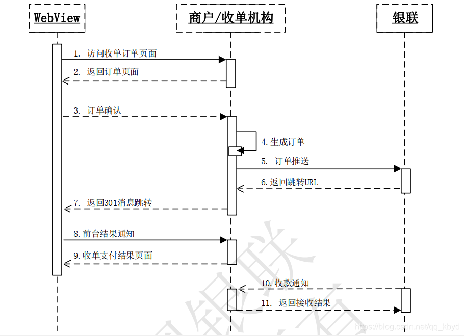业务场景:银联 JS 支付指二维码为收单机构订单的 URL,用户扫描二维码后在 APP 浏览器中打开收单机构的 H5 页面,收单机构在确认支付后调用银联统一网关,由银联调用 APP 完成支付的场景。