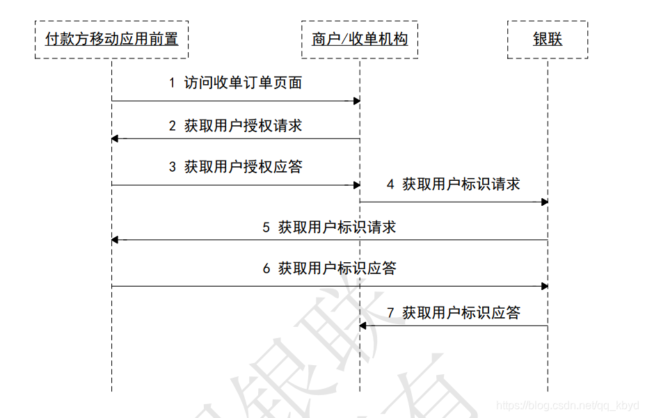 3、获取用户标识,需拿 userAuthCode 和 银联支付标识 appUpIdentifier 置换。其中appUpIdentifier 的获取方式:通过用户请求的 HTTP 中的 User Agent 截取,银联支付标识的格式为“UnionPay/<版本号><App标识>”,从前往后截取,匹配“UnionPay/”作为开始,至英文空格之间的内容为版本号(如 1.0、1.1、2.0),从英文空格开始,至非字母非数字结束,之间的内容为每一个 APP 的特殊标识。