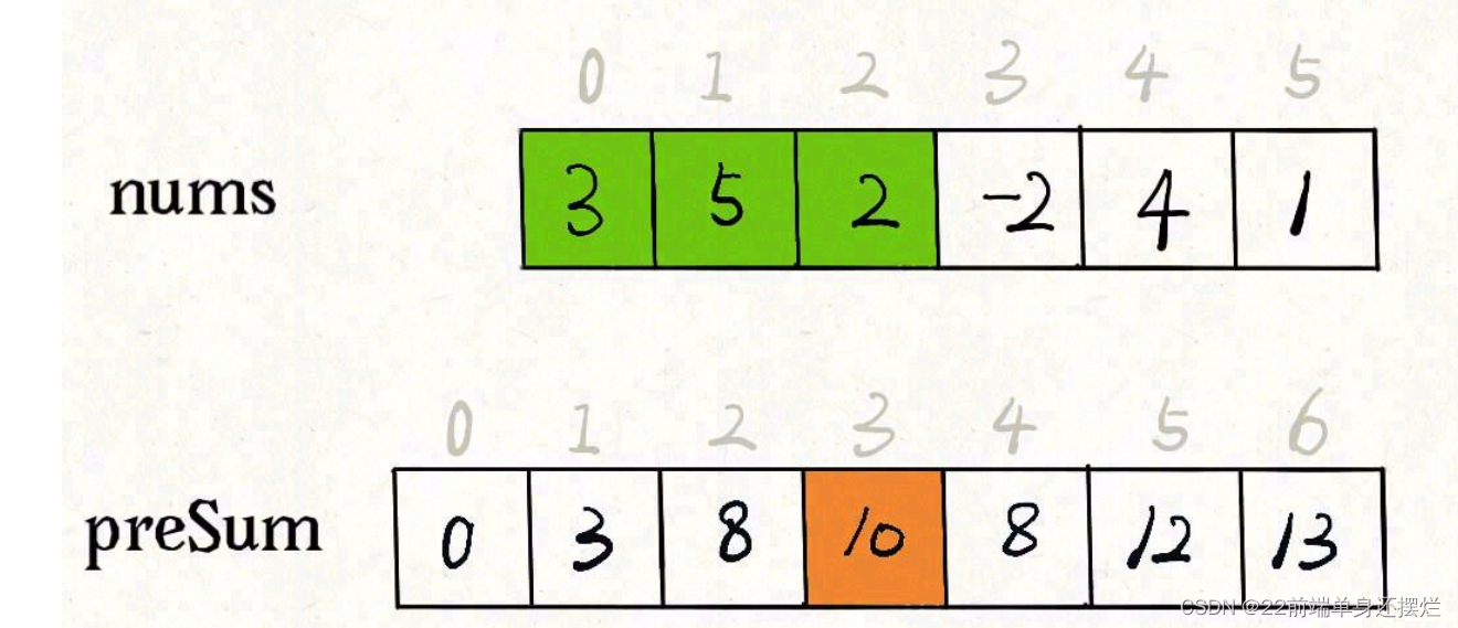 数组中的前缀和 前缀和指一个数组的某下标之前的所有元素的和(包含其本身)。前缀和分为一维前缀和,以及二维前缀和。前缀和是一种重要的预处理方式,能够降低算法的时间复杂度。看完这道题,我们可能首先想到的是遍历数组。题目要求我们实现这样一个类sumRange函数返回一个索引区间的和这样写可以到到效果,但是效率会很差,因为sumRange方法会被频繁调用,而他的复杂度是O(N),其中N代表nums数组的长度。这道题的最优解法是使用前缀和技巧,将sumRange函数的时间复杂度将为O(1),就是不要在函数中使用for循环。如