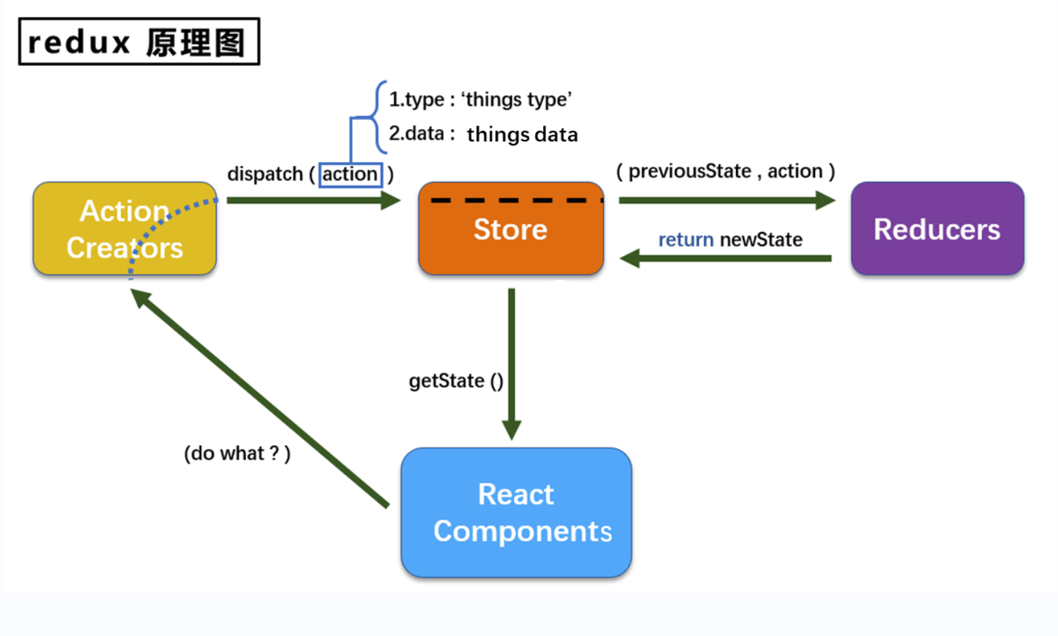 浅说Redux 我们在使用react的时候,通常使用state来做状态管理,除了state之外,我们还可以使用redux来做状态管理。redux是第三方出的一个库,与react没有任何关系,就像Java与JavaScript。先让我们来看一张图:1、原理我们先不讨论react是怎么和redux链接的,先看下他们之间是怎样工作的。首先,当我们在react中的Components中调用方法改变状态时,我们将这次的行为用一个对象封装起来,我们称为它为一个action,它由两个key:value组成,也就是两个属性.