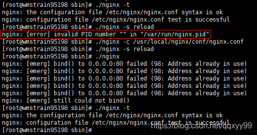 以上操作过程中,如果没有查看Nginx进程号,直接进行了重启,可能会出现如下报错: