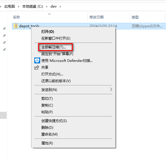 选择解压路径,这里以 C:\dev\depot_tools为例。