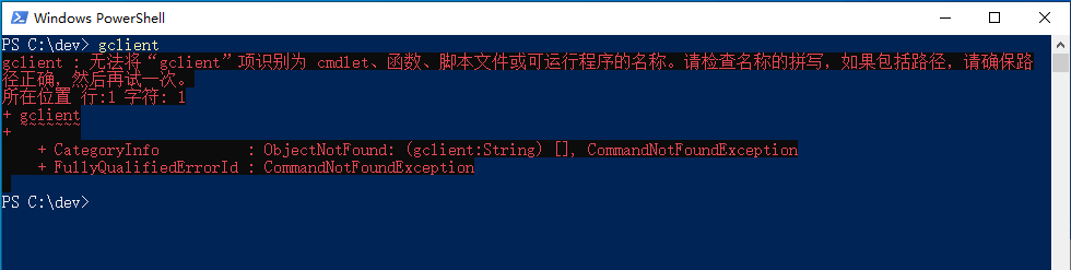 在打开的Windows PowerShell工具的窗体中输入“glcient”。