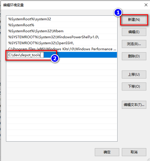 在弹出的编辑环境变量窗体点击新建按钮,填写我们在解压depot_tools的路径。
