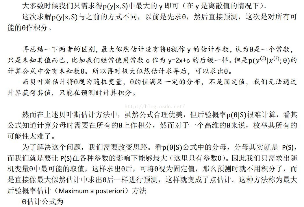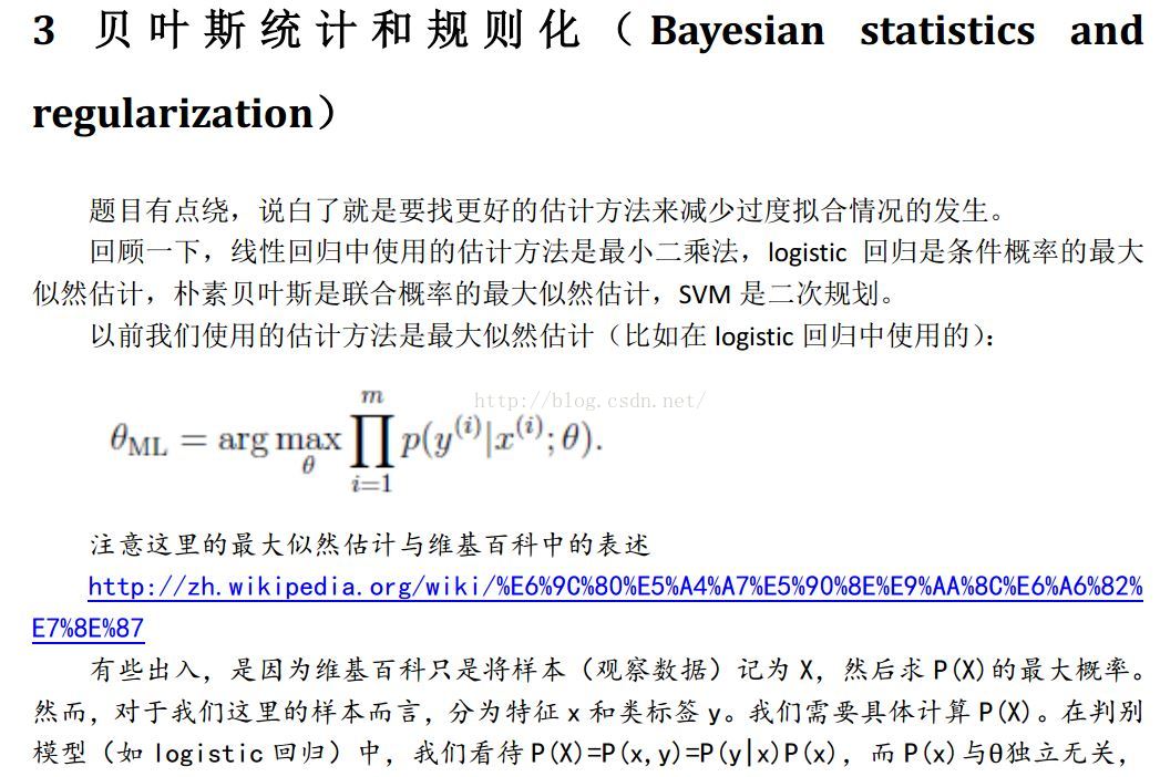 关于贝叶斯统计和规则化我个人认为就是找出新的估计方法来代替原有的最大似然估计这个方法来减少过拟合这种情况的发生。下面关于贝叶斯统计和规则化的笔记,依旧援引自之前提到的那位大神……(想想我也真是够厚颜无耻的……)。