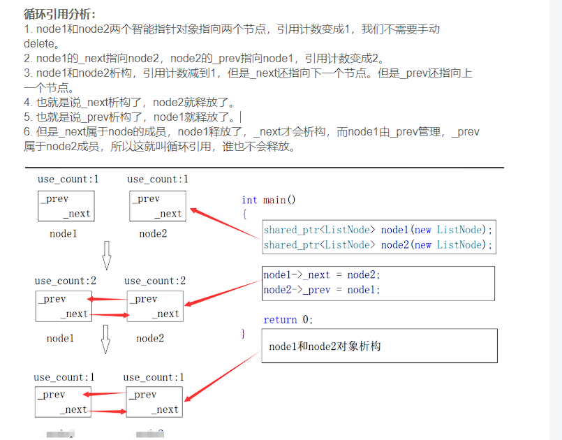 weak指针解决的办法就是把prev弄成weak,那么就不会出现node1要析构要经过node2同意!
