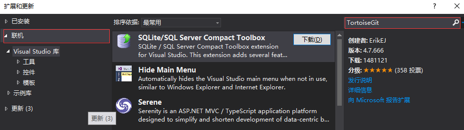 3、选择"联机",在搜索框输入"TortoiseGit"