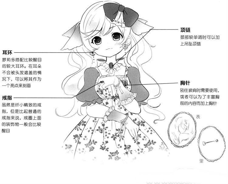 动漫美少女的配饰怎么画?插画漫画入门教程!动漫二次元美少女经常会佩戴一些做工精致以及设计精美的小饰品。如下图:
