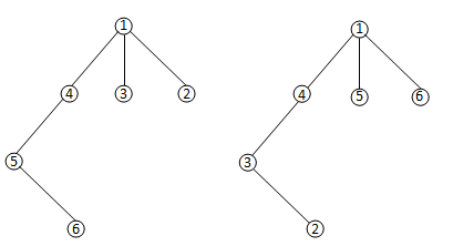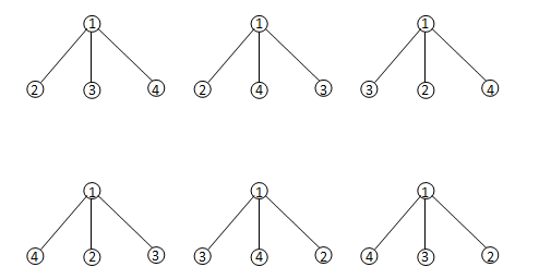 上述节点1即为有3个叶子儿子节点的节点,它的叶子儿子节点可以有n!种编号方式,故上述有3!=6种编号方案