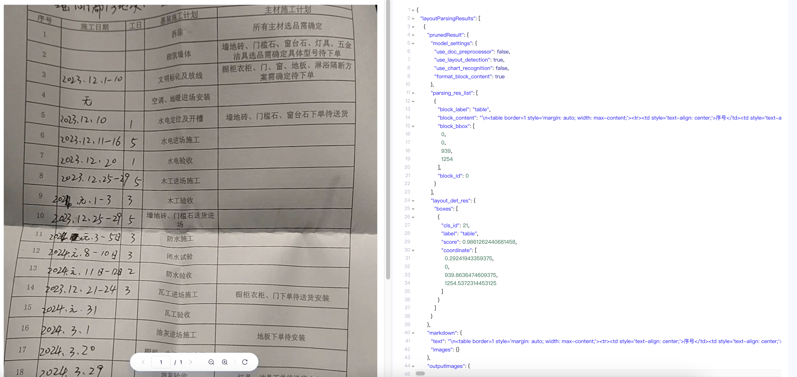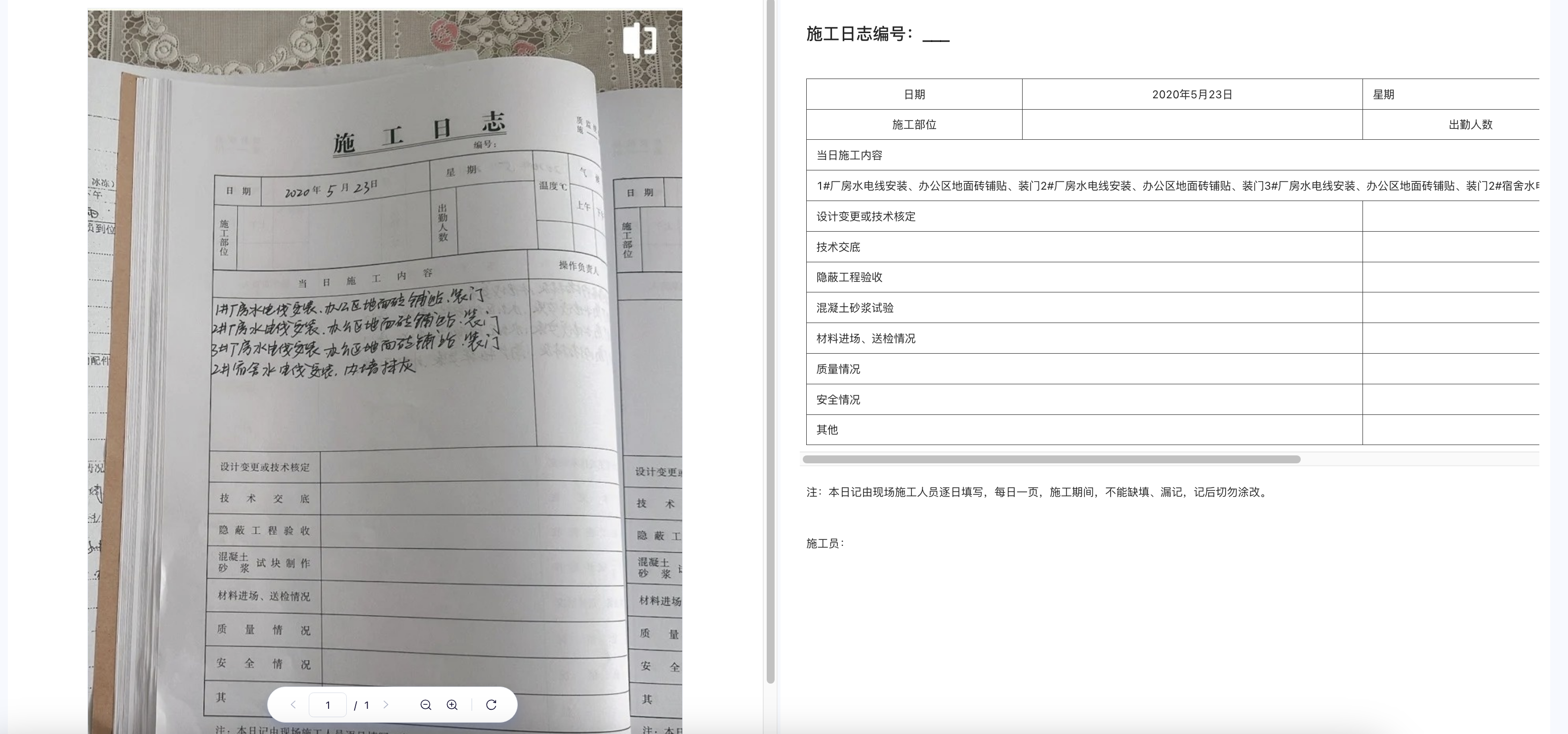 - 适配逻辑:通过表格标题关键词(如 “监理日志”)+ 字段特征(如 “整改意见”)自动匹配识别模型,无需用户手动配置模板。