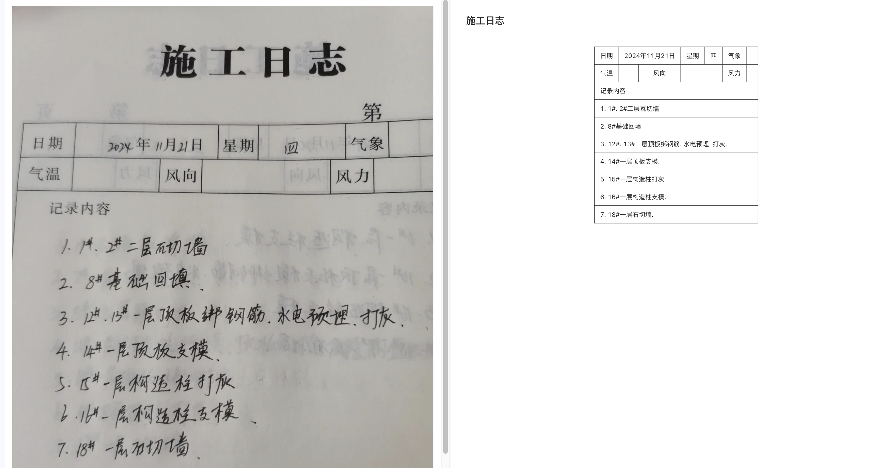 在建筑工程全生命周期管理中,施工日志、监理日志、计划表、监测表、记录表 作为核心数据载体,需满足《建设工程文件归档规范》(GB/T 50328-2014)中 “可追溯、可验证” 要求。但传统人工处理模式存在显著技术痛点: